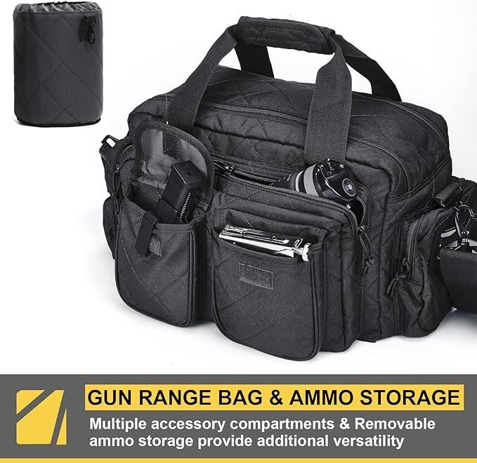 Die Range Bag ist langlebig und dennoch leicht. Hergestellt aus hochwertigem 600D Polyestergewebe.Die Tactical Range Bag hat mehrere Fächer gepolstert, um Ihre Handfeuerwaffen, Ohrenschützer, Schutzbrillen, Magazine, Munition und Zubehör usw. sicher und kratzfest zu halten.