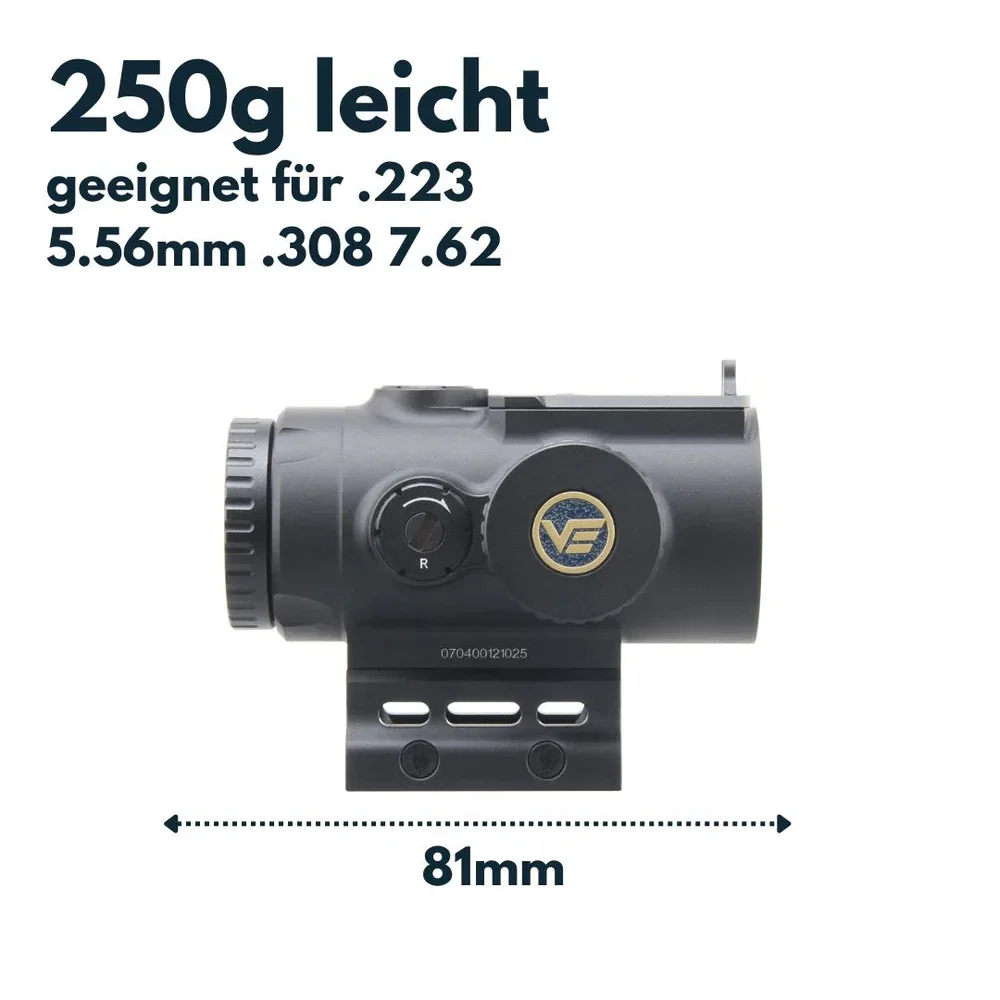Das SCPS-M04 mit 4x Vergrößerung bietet zudem eine Möglichkeit ein Reddot mit MAG Footprint (RMSc kompatibel) auf der Oberseite zu montieren für den schnellen Wechsel zwischen 1x und 4x Vergrößerung. Kompatible Reddots dazu finden Sie am Ende der Beschreibung.