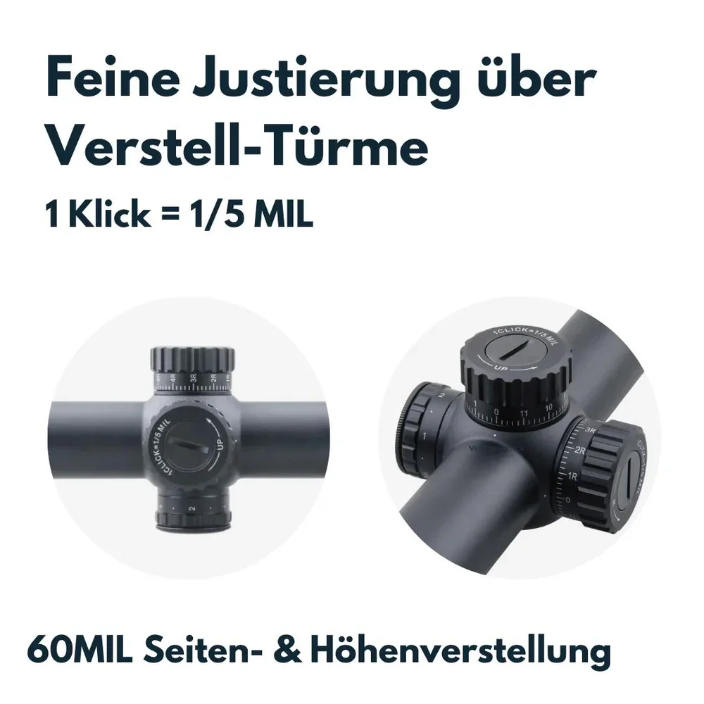 Die fein justierbaren und arretierbaren Verstelltürme mit 1 cm auf 100 m MRAD Klickverstellung machen es zum idealen Begleiter auch für anspruchsvolle Jagdsituationen oder auf dem Schießstand.