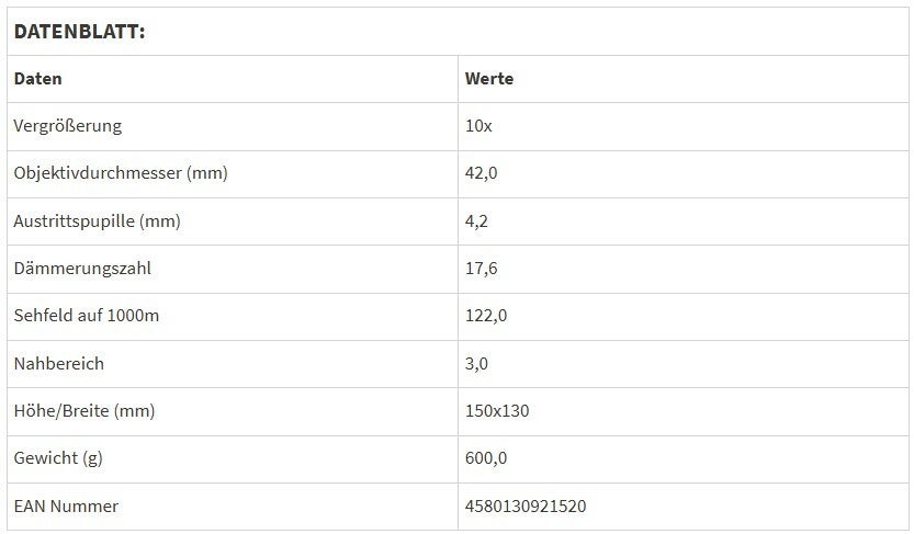 Robuste, leichte Fernglas als idealer Begleiter. Die Gummiarmierung sorgt für einen festen Griff und schützt das Glas vor Stößen, Schlägen und Stürzen. Dank der Wasserdichtigkeit (bis zu 1 m für bis zu 10 Minuten) und der beschlagfreien Konstruktion ist es für jede Witterung geeignet. Das weiten Sehfeld lassen sich Objekte leicht finden und verfolgen.