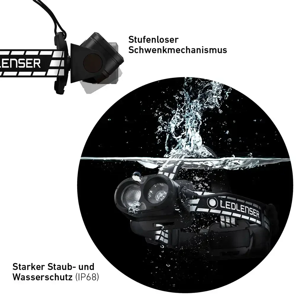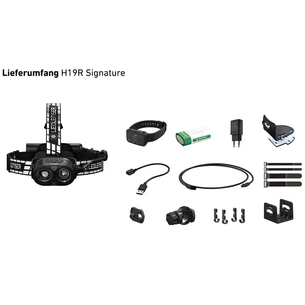 Die wiederaufladbare Profi-Stirnlampe H19R Signature verfügt über eine sehr starke Leuchtkraft von bis zu 4000 Lumen im Boost-Modus und individuelle Fokussierbarkeit der beiden LED-Leuchten zwischen Nah- und Fernlicht. Per Bluetooth und kostenloser Ledlenser Connect App (nutzbar für die Betriebssysteme iOS ab Version 11.0 und Android ab Version 5.0) lässt sie sich einfach mit dem Smartphone steuern und personalisieren. Alternativ lässt sich die Stirnlampe über den Drei-Wege-Schalter am schwenkbaren Lampenkopf oder über die beiliegende Fernbedienung für das Handgelenk bedienen. Zu den weiteren Eigenschaften gehören ein zusätzliches Rotlicht, die automatische Abblendefunktion Optisense, ein hoher Staub- und Wasserschutz (Schutzklasse IP68), und eine Transportsicherung gegen unbeabsichtigtes Einschalten. Der vielseitige Lieferumfang ermöglicht darüber hinaus die flexible Nutzung z.B. auf Helmen oder an Lenkerstangen.