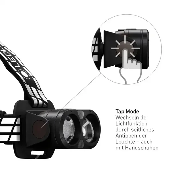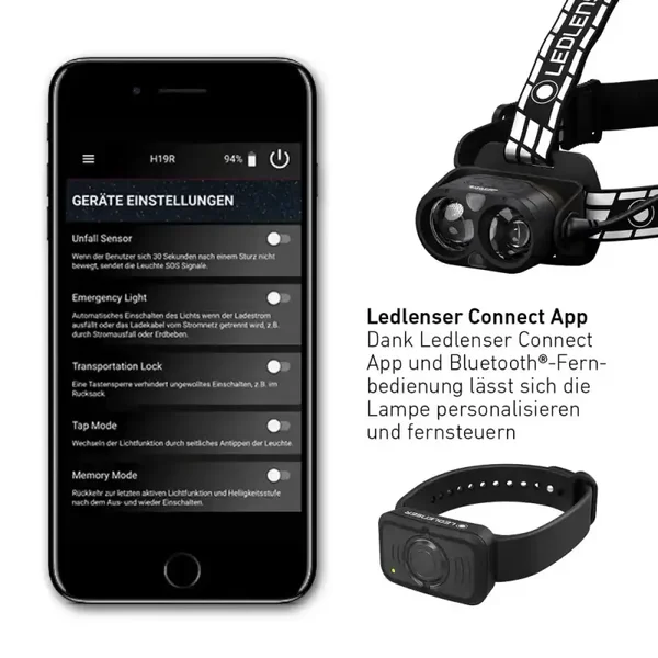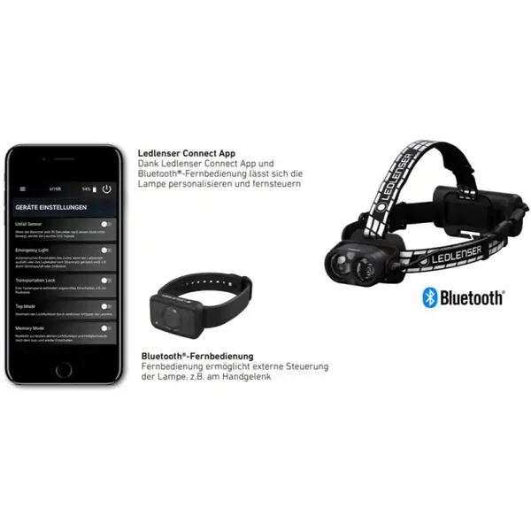 - Bluetooth-Verbindung zum Smartphone für personalisierte Einstellungen via Ledlenser Connect App; zusätzliche Fernbedienung ermöglicht externe Steuerung der Lampe, z.B. am Handgelenk