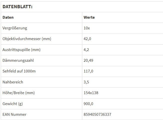Mit einem Sehfeld von 117 m und einem Gewicht von nur 900 g bei sehr kompakten Maßen von 15,4x13,8x6,8 cm (LxBxH) eignet sich das Glas auch für die längste Pirsch.