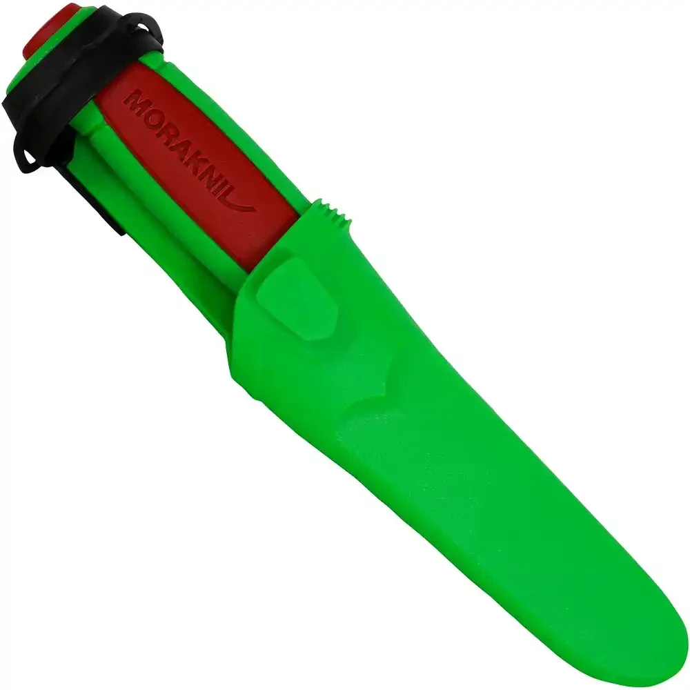 Im Lieferumfang enthalten ist auch eine Polymerscheide, die mit dem Morakniv-Smart-Button-System versehen ist. Hierdurch lassen sich mehrere Messer für unterschiedliche Zwecke aneinander befestigen. Außerdem verfügt die Messerscheide über einen praktischen Clip zur einfachen Befestigung an einem Gürtel.