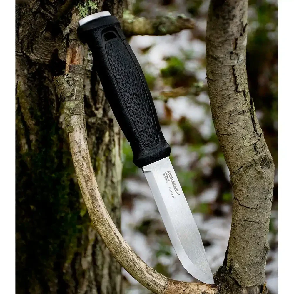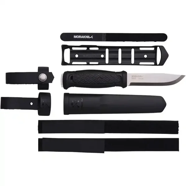 Full-Tang Klinge aus Edelstahl mit einer Länge von 109 mm, und dem für Morakniv typischen Scandi-Schliff. Am Klingenrücken ist es möglich einen Feuerstarter zu nutzen. Griff aus robustem Polyamid. Inklusiver der neuartigen Multi-Mount-Scheide.