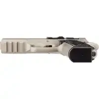 Die Cerakote Beschichtung der Pistole ist in der Farbgebung Titan gehalten, mit unterschiedlichen Farbvarianten der Griffschale sowie des Magazinauslöseknopfes.